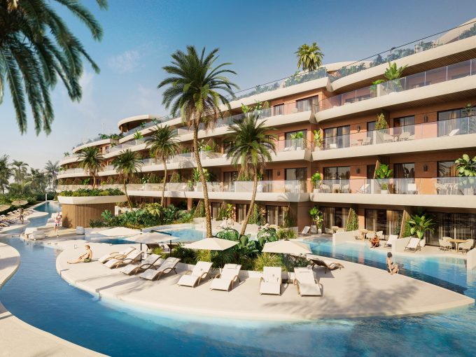Las amenidades incluyen un spa wellness center, piscinas, áreas de barbacoa, canchas de pickleball, gimnasio, rooftop con piscina y restaurantes. El complejo cuenta con un lobby de diseño sofisticado y seguridad 24/7, garantizando tranquilidad y confort a sus residentes.